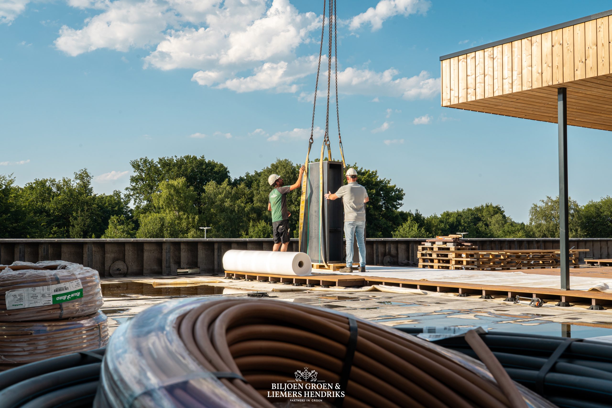 Eind februari 2025 is gestart met de realisatie. Als eerste is het grind van het dak verwijderd. Begin maart is de dakbedekking vervangen. Meteen daarna is met de bouw van de serre gestart en werd de daktuin aangelegd.Serre