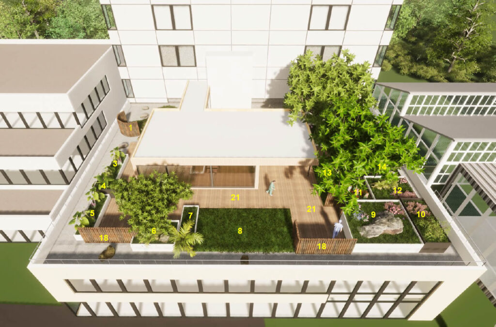 In het ontwerp is rekening gehouden met de nodige afwatering, noodzakelijk onderhoud, een mooi uitzicht vanuit de serre, goede toegankelijkheid en de nodige privacy voor patiënten, bezoekers en personeel. Ook is gedacht aan tuinmeubilair en buitenverlichting.De artist impressions van de daktuin geven een goede indruk van hoe het er straks uit gaat zien. Hieronder vind je een plattegrond, waaropje precies kunt zien hoe de daktuin is ingericht.